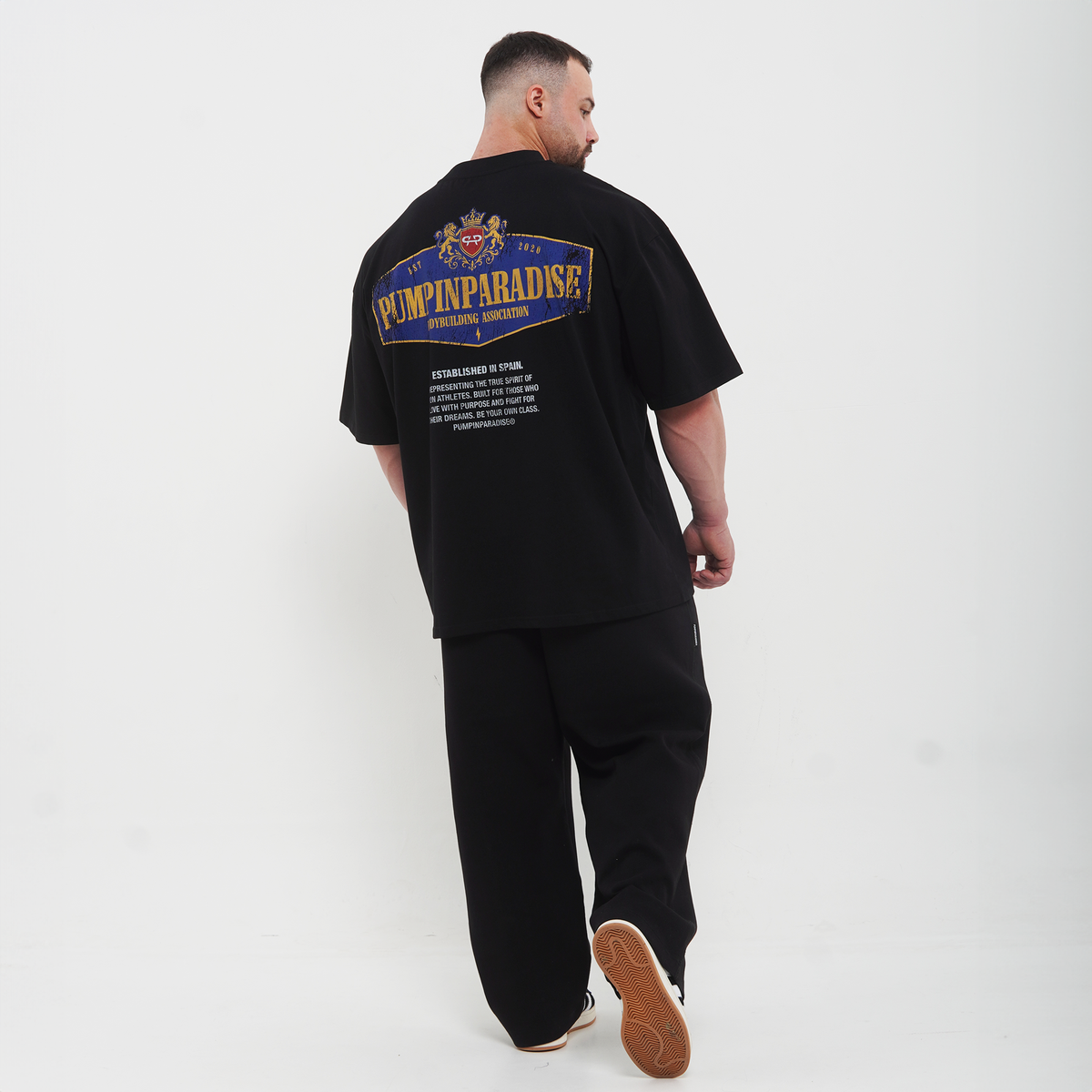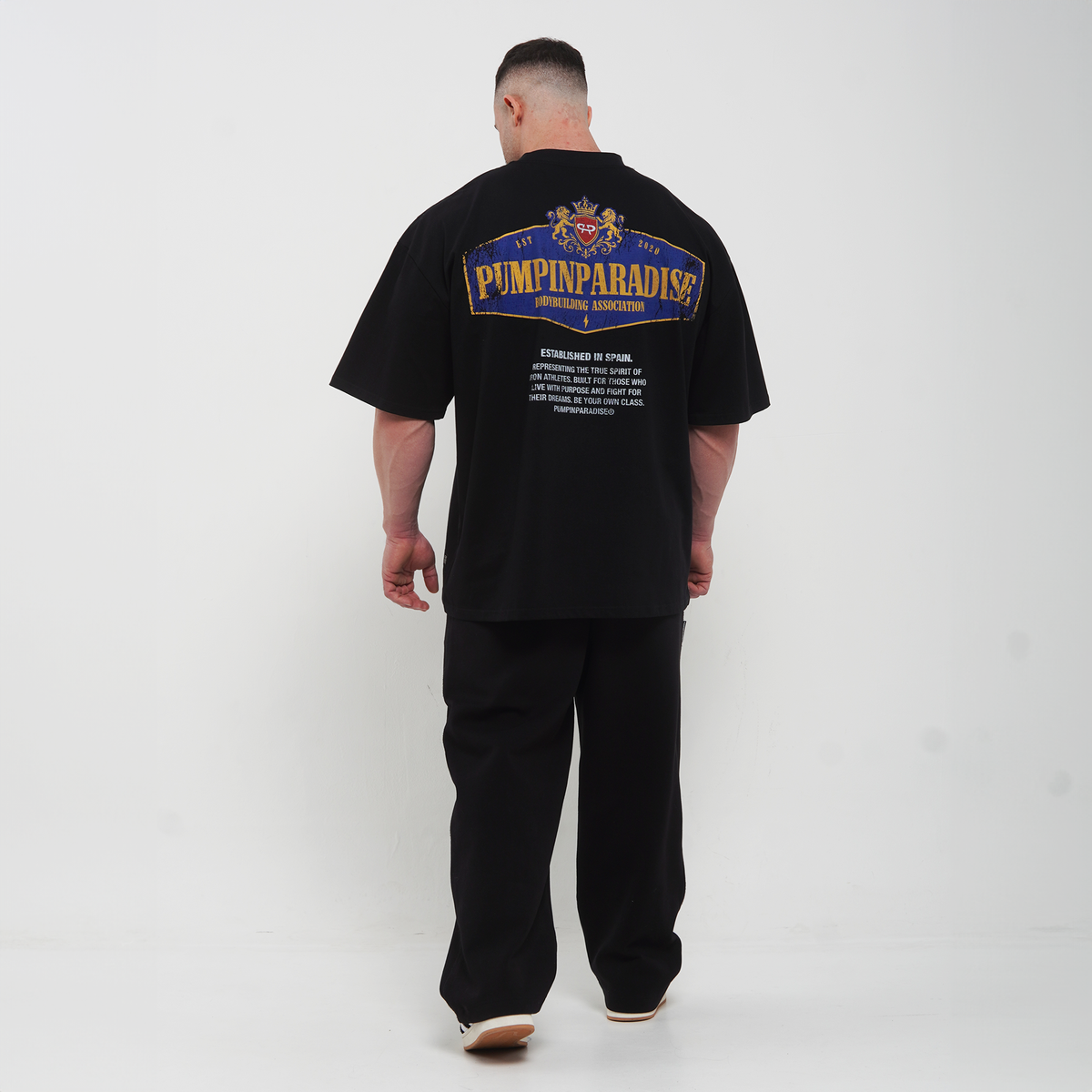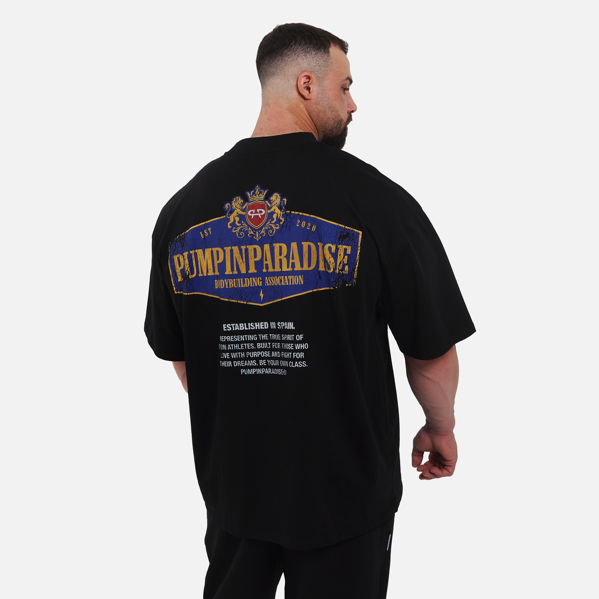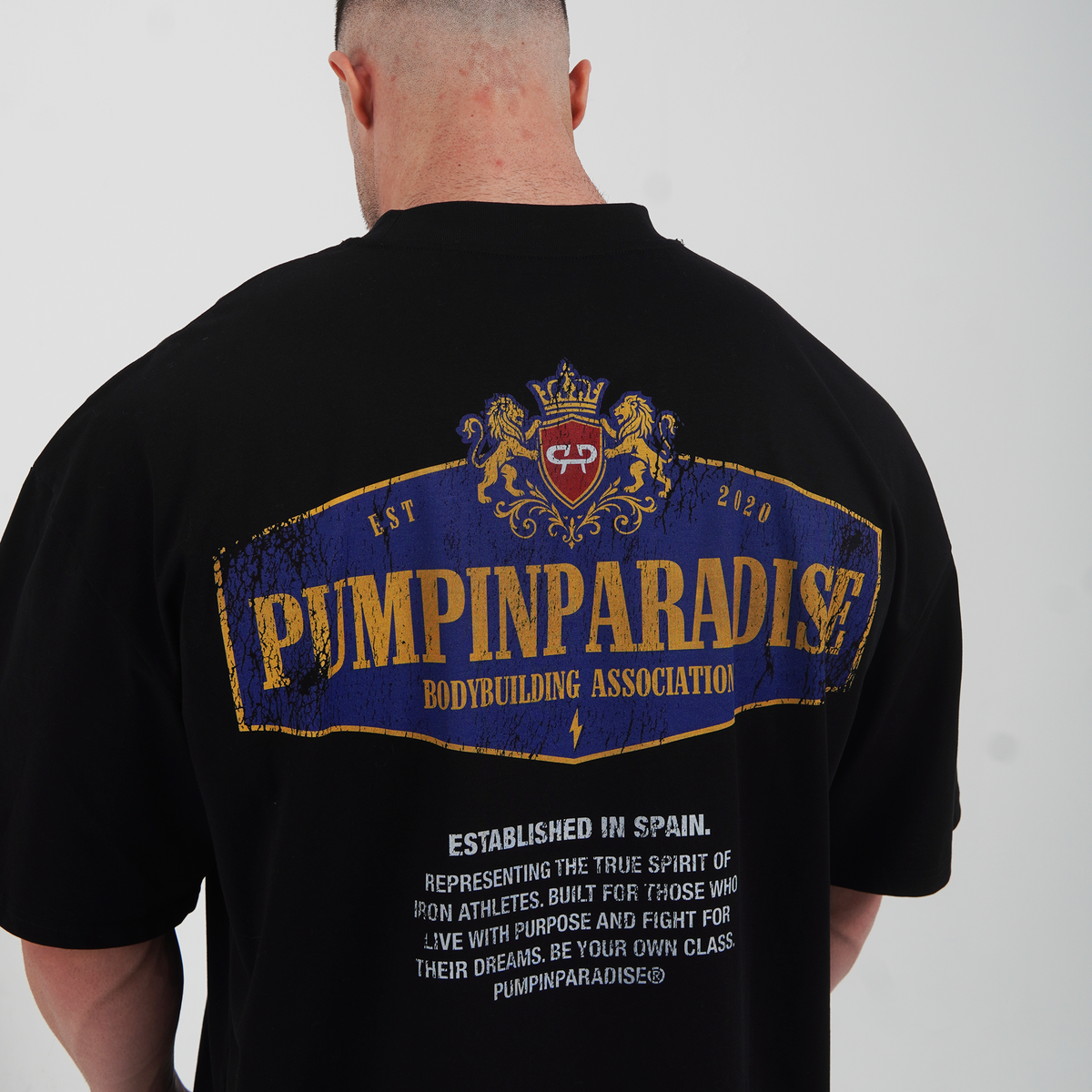 Camiseta oversize inspirada en la Golden Era del culturismo. Creada y diseñada para los amantes del hierro que quieran unirse a la "ASOCIACIÓN DE CULTURISMO" de PUMP IN PARADISE.