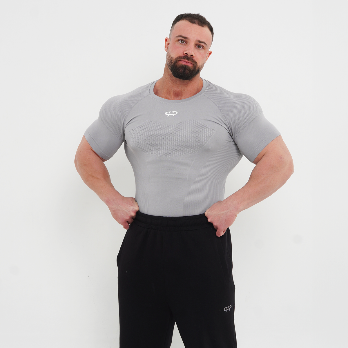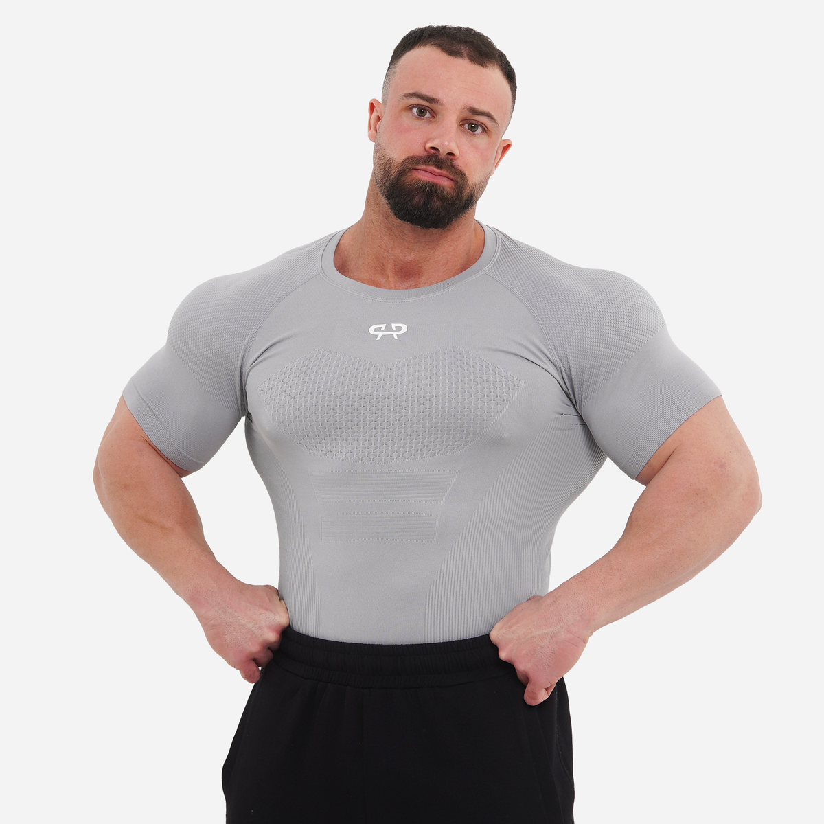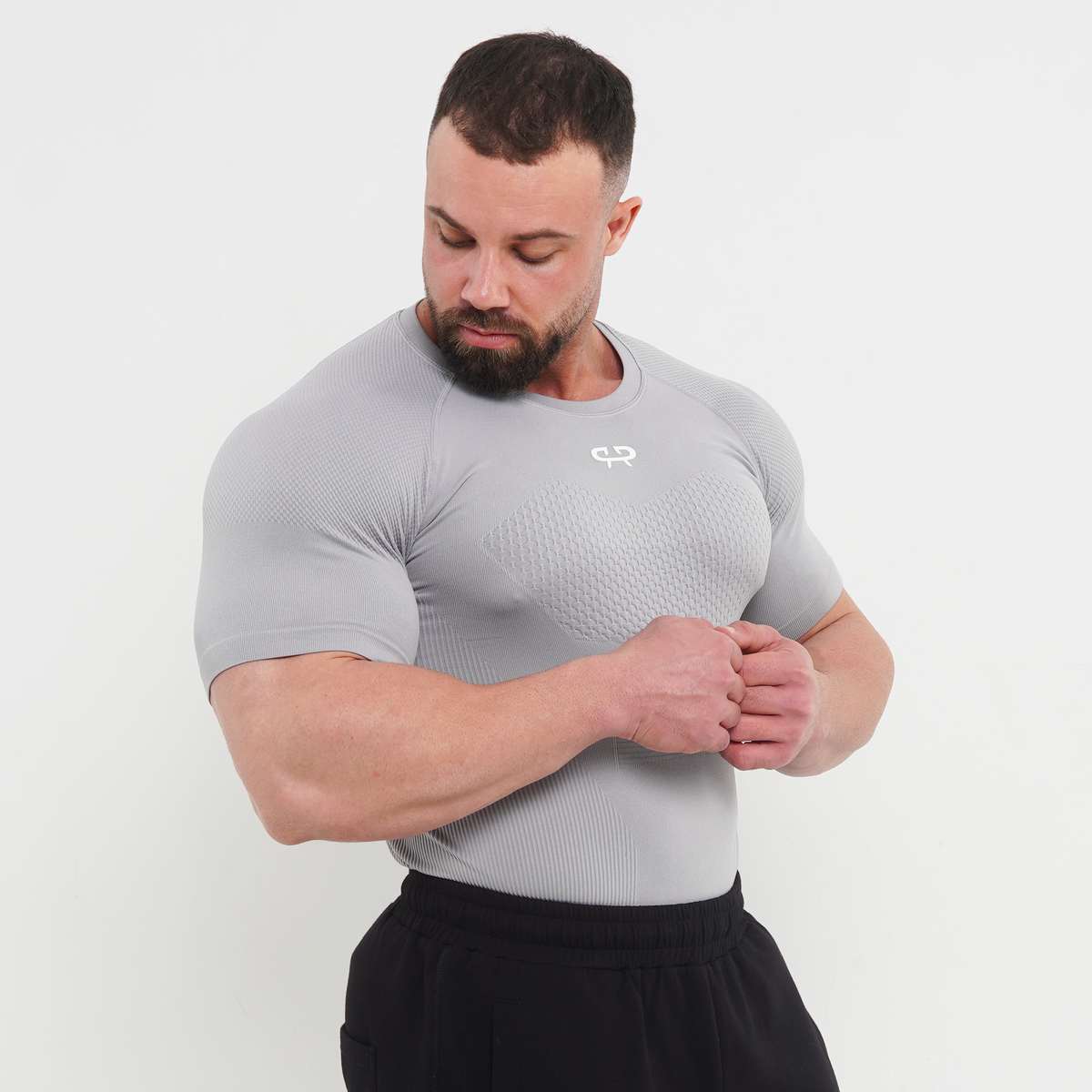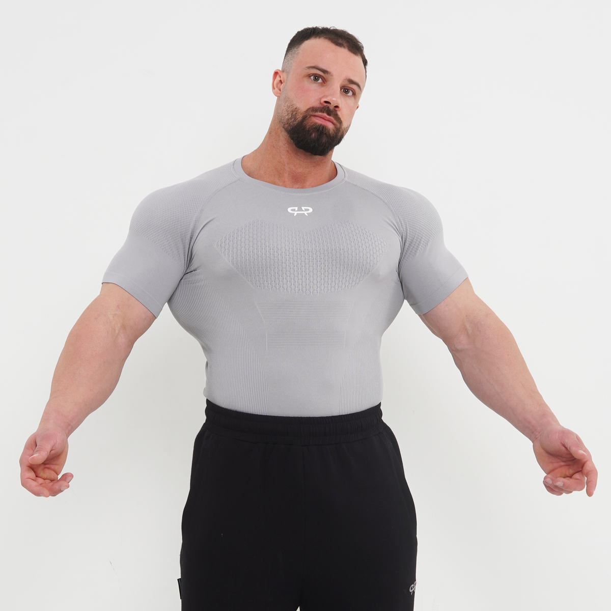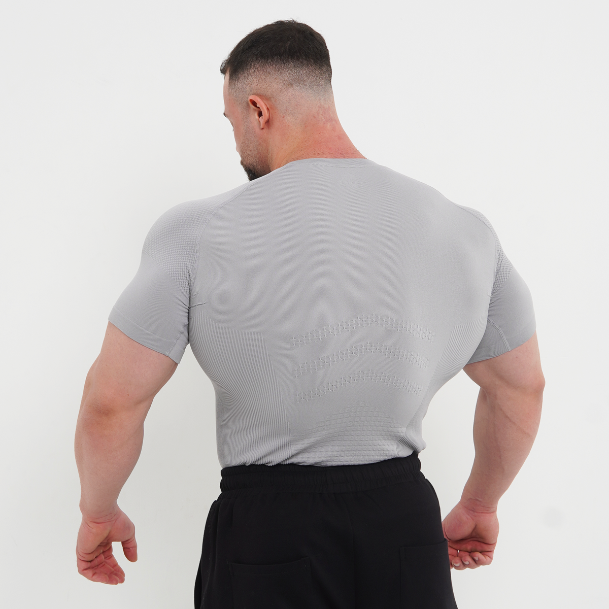 We introduce The Phantom Compression Tee. Engineered to function as a true second skin. Textured paneling across the chest and shoulders creates a sharp, defined silhouette.
