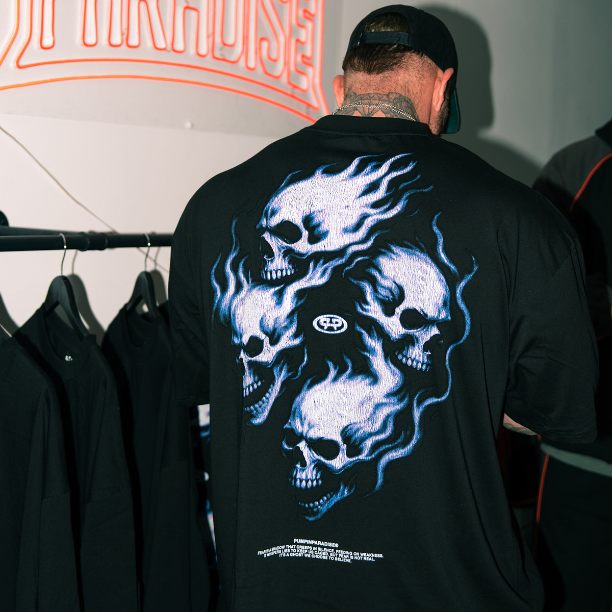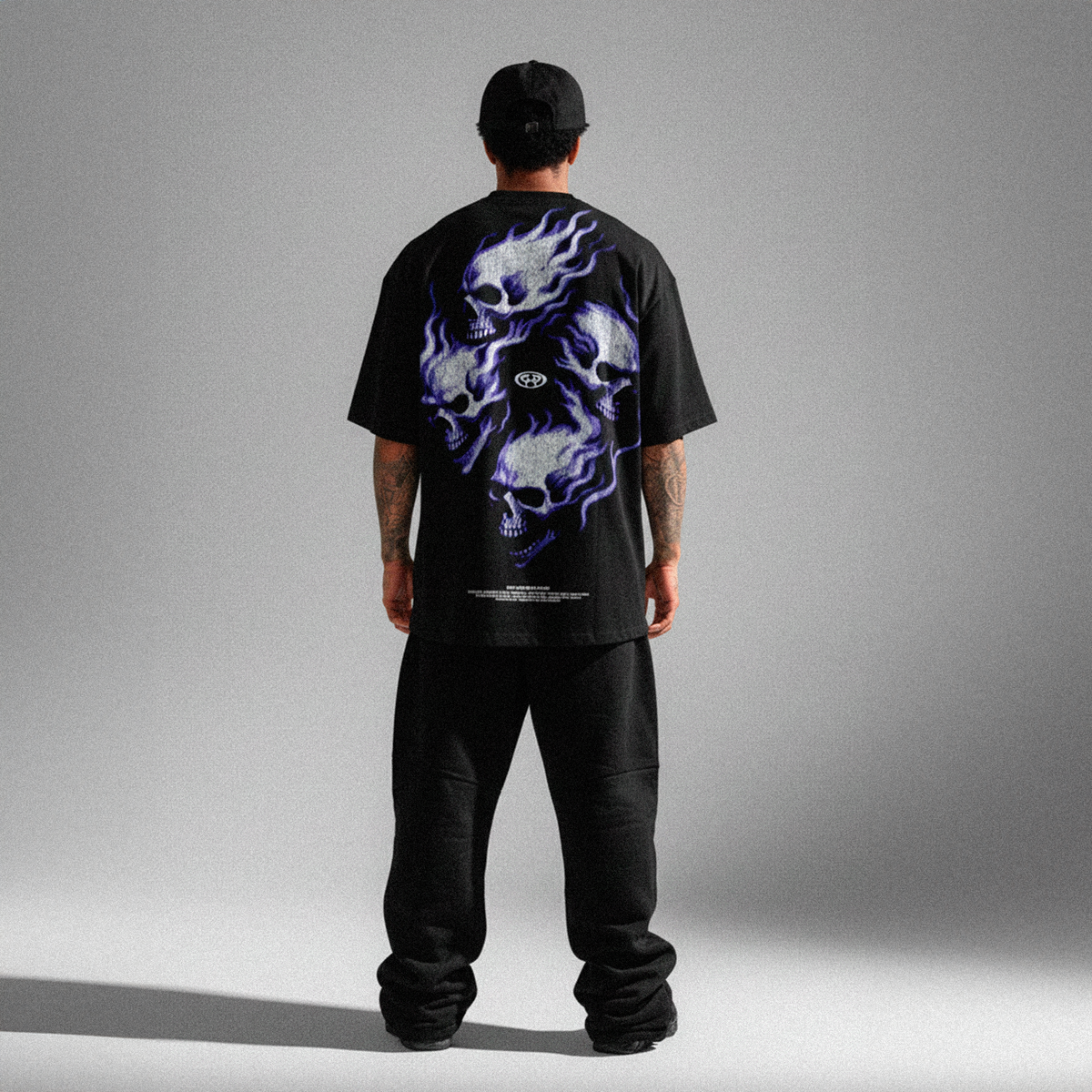 Design featuring four purple flaming skulls representing the internal struggle against fear. This piece combines a bold aesthetic with a clear message: fear has no power here.
