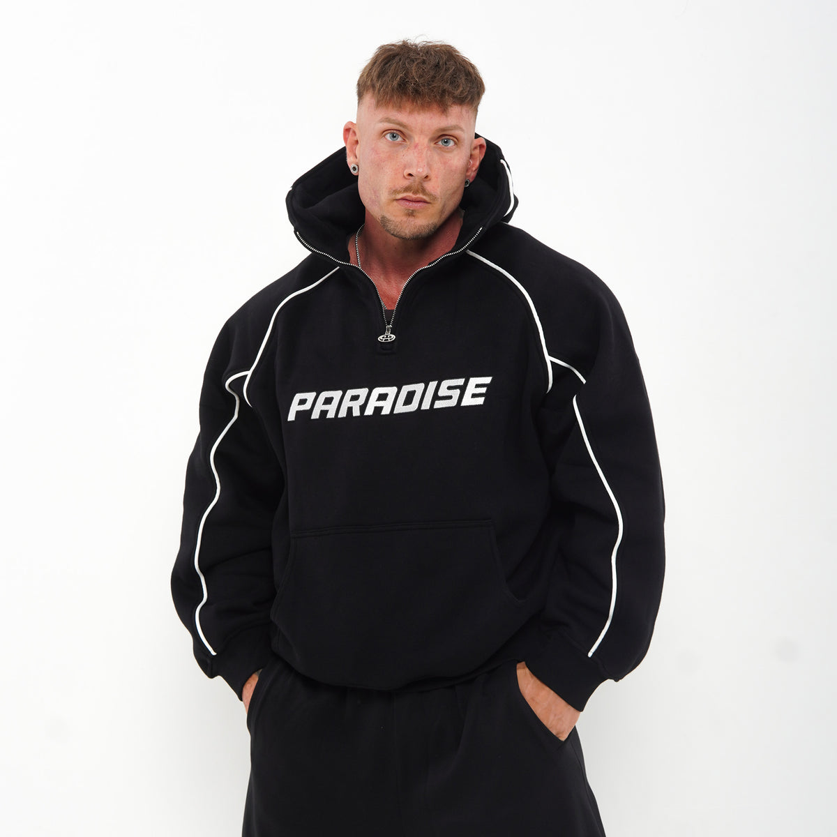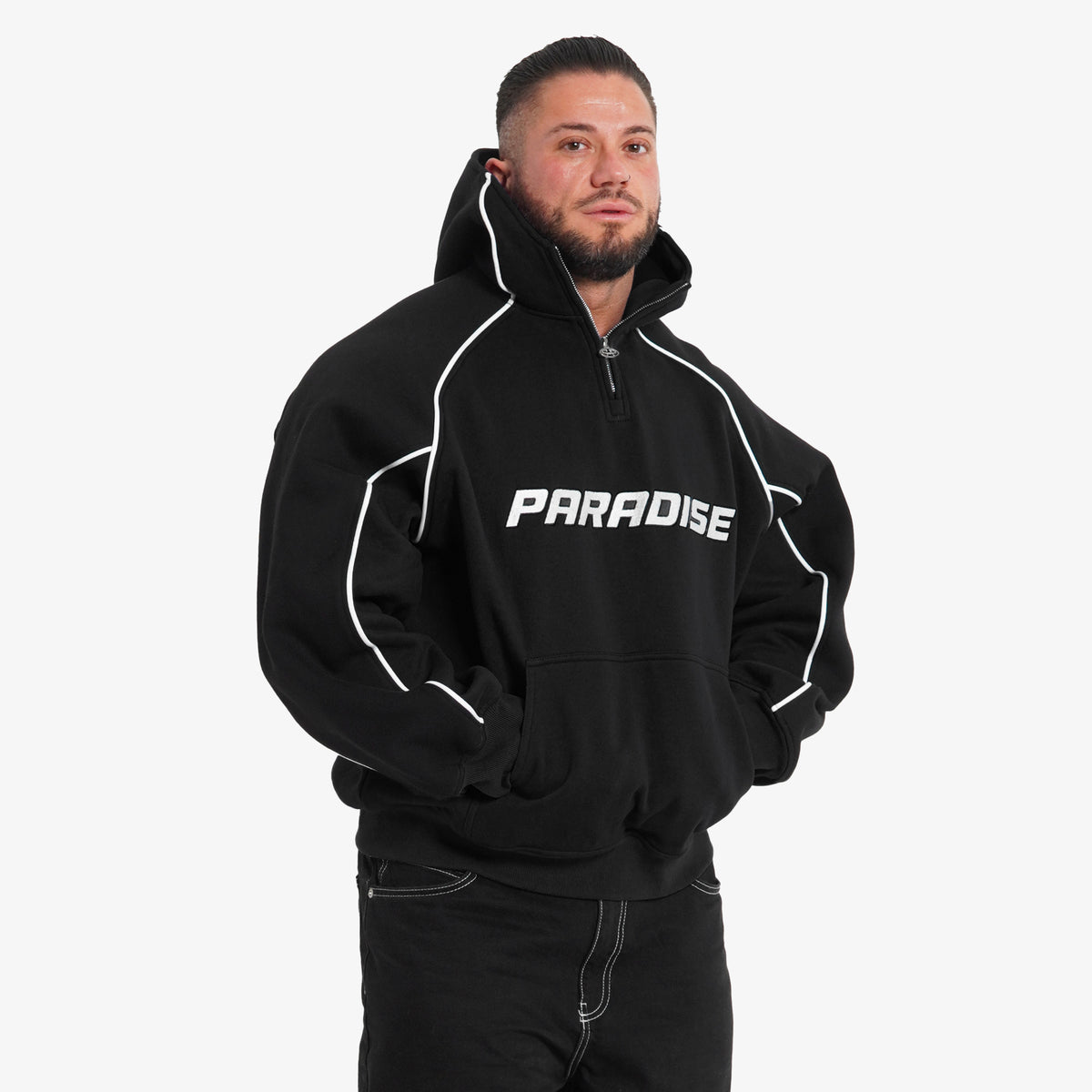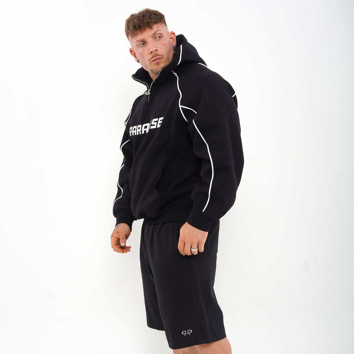 Oversize heavyweight half zip hoodie. Created with color block style and contrast piping. Full black with the white piping line make a perfect combination.