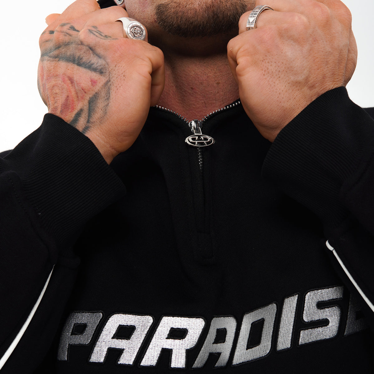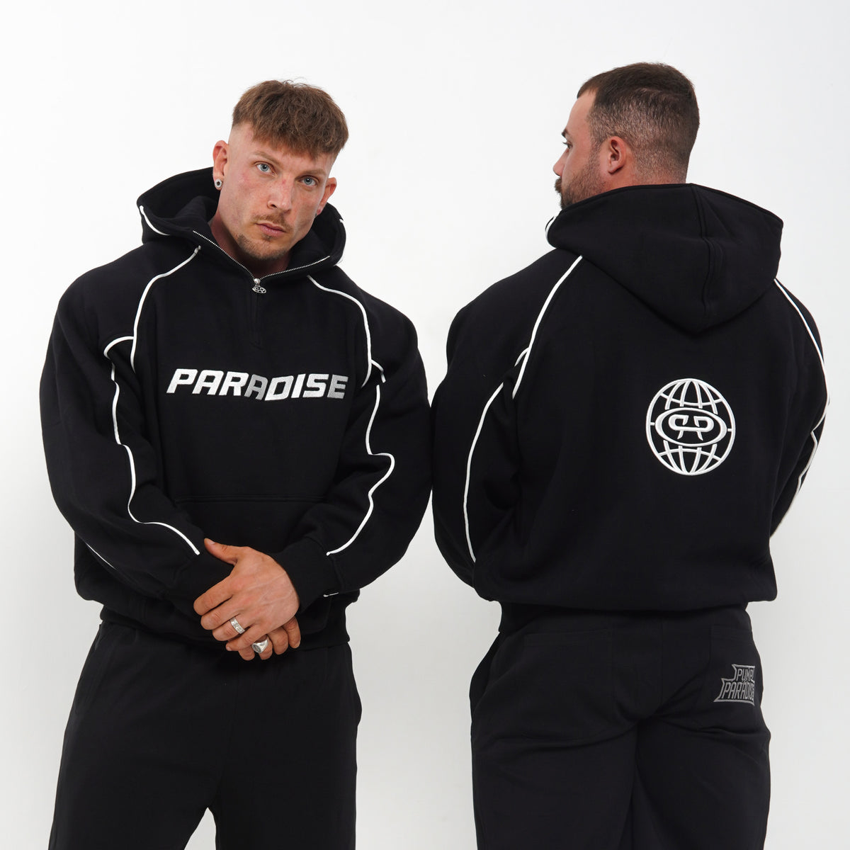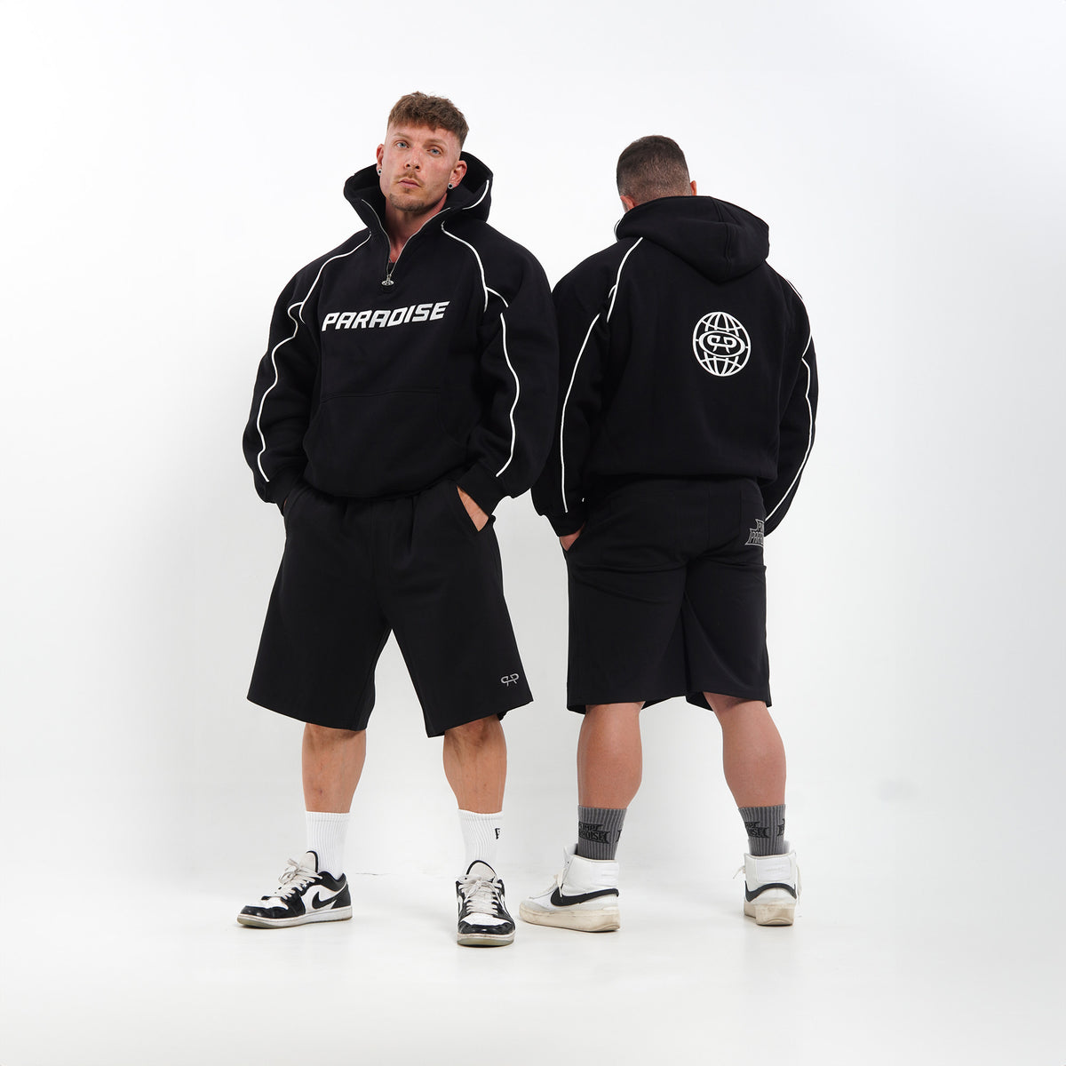 Oversize heavyweight half zip hoodie. Created with color block style and contrast piping. Full black with the white piping line make a perfect combination.