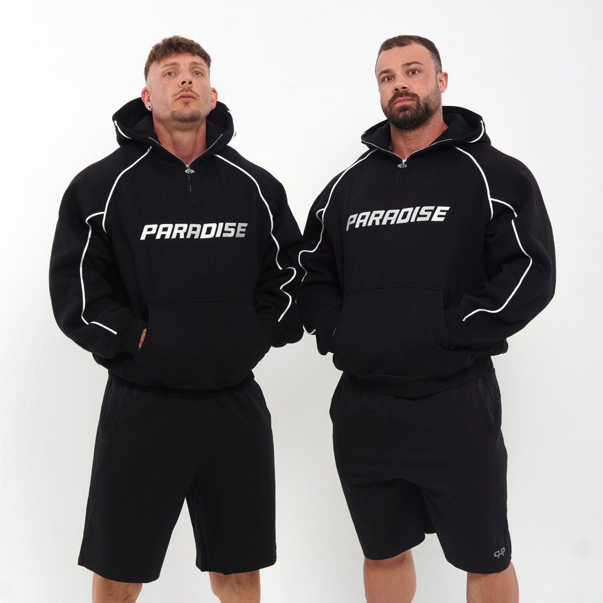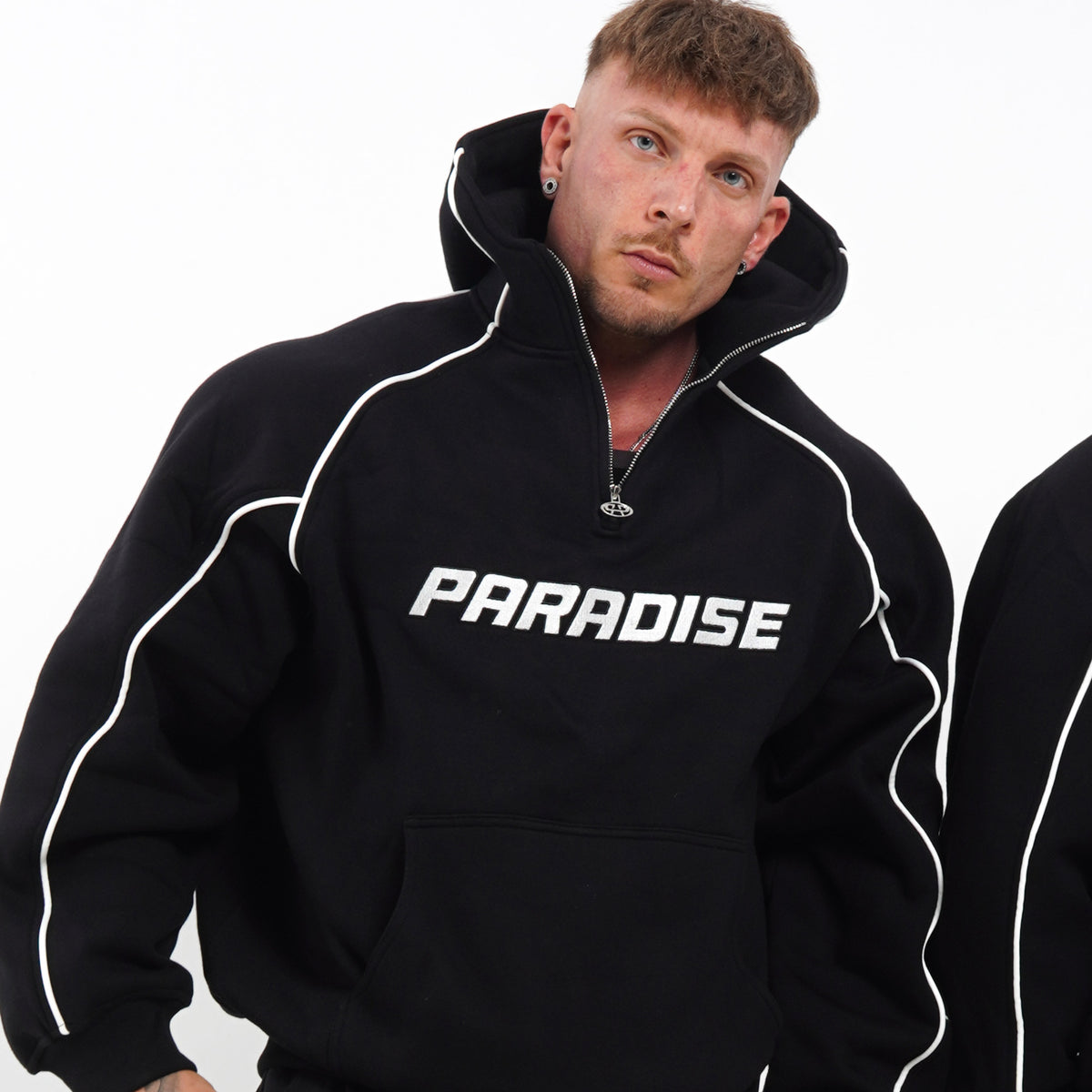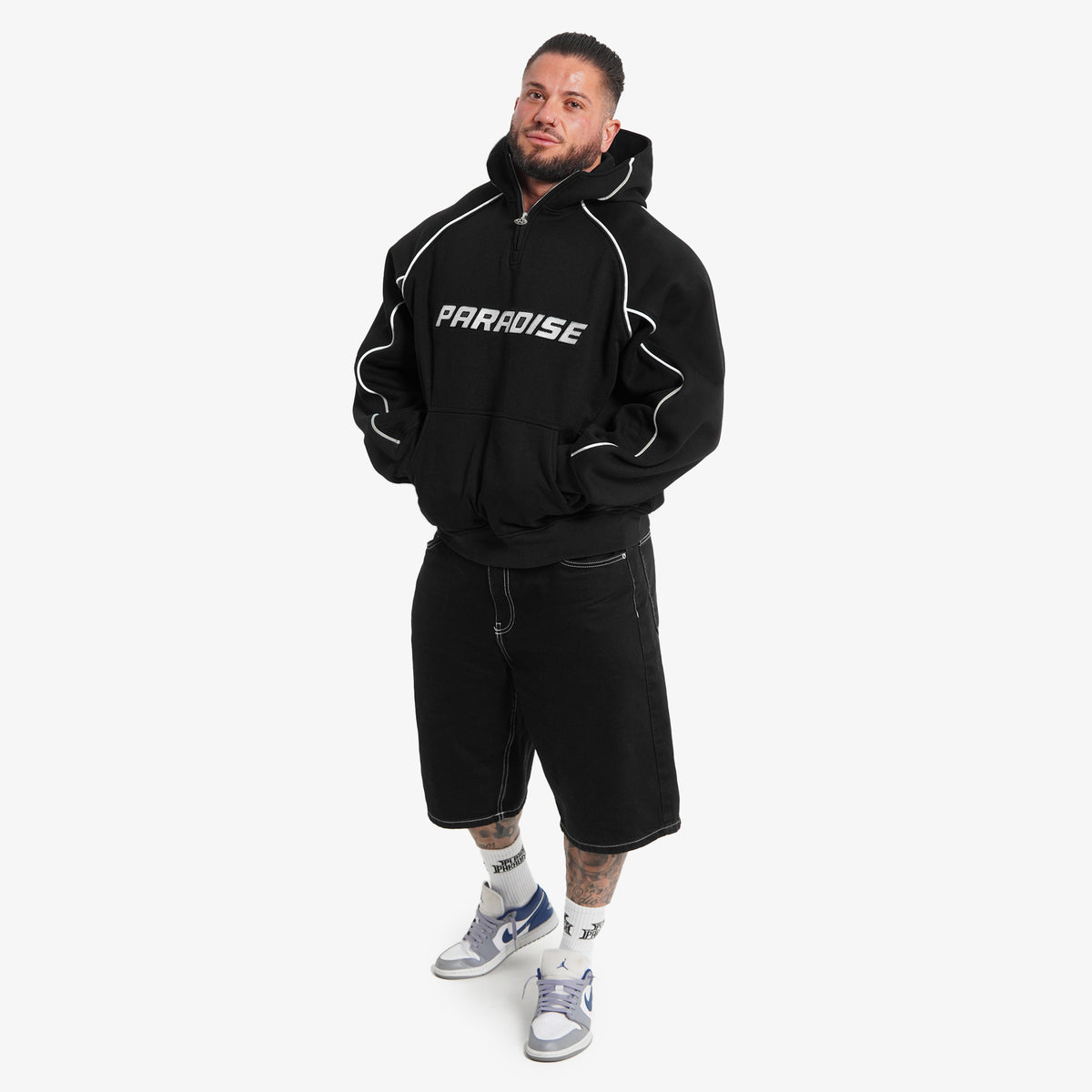Oversize heavyweight half zip hoodie. Created with color block style and contrast piping. Full black with the white piping line make a perfect combination.