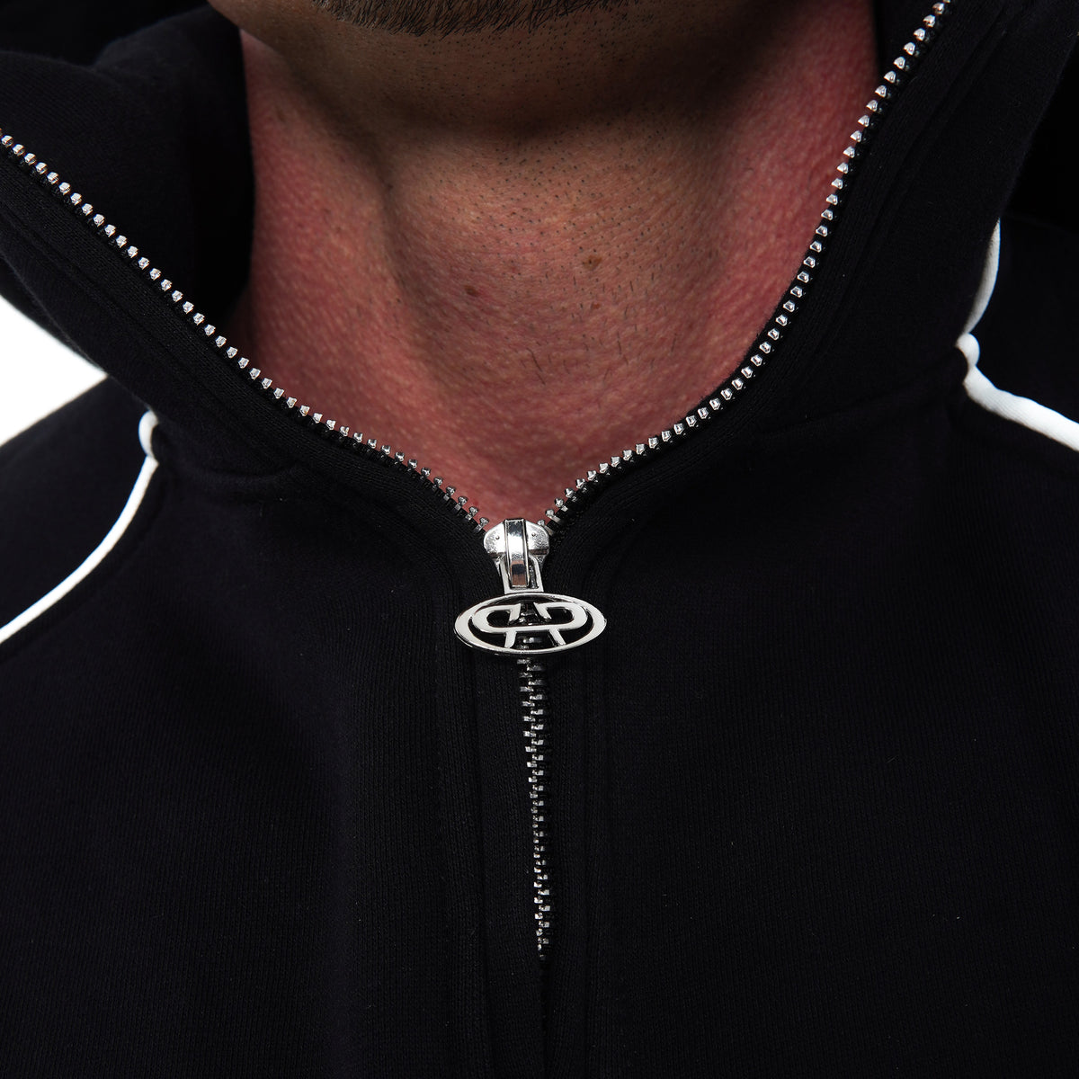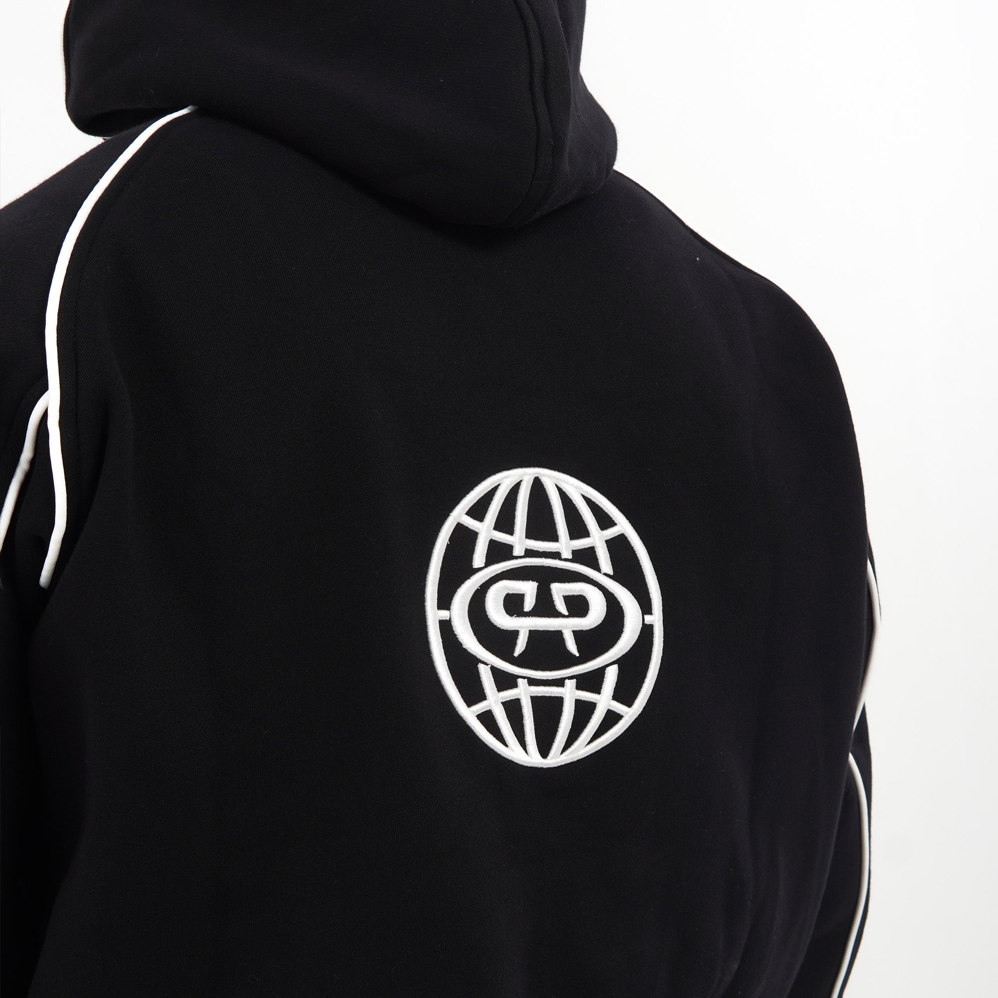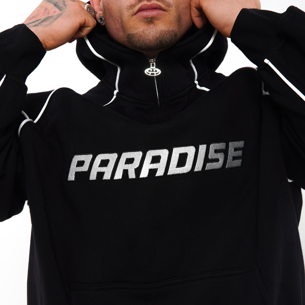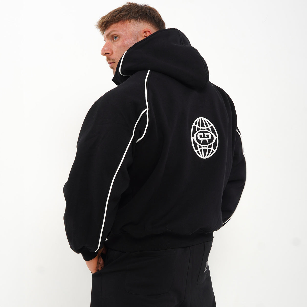 Oversize heavyweight half zip hoodie. Created with color block style and contrast piping. Full black with the white piping line make a perfect combination.