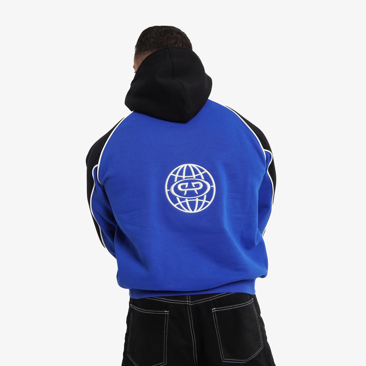 Oversize heavyweight half zip hoodie. Created with color block style and contrast piping. Blue and black with the white piping line make a perfect combination.